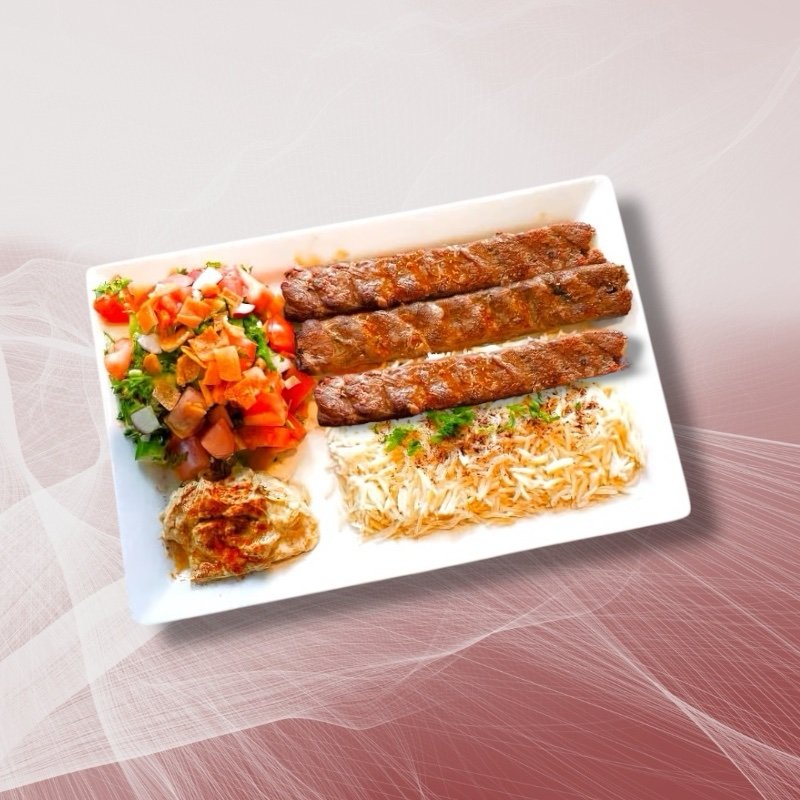 3 skewers of shish tawouk, kafta, and sujok served on a bed of rice with salad, hummus, pita, and tahini. Hot sauce available upon request.